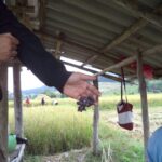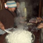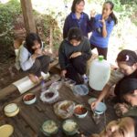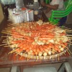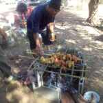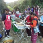 Anschließend wurde der Reis vorportioniert, die Eier geschält und die ersten Hühnerflügel gebraten. Im nächsten Schritt wurden die provisorisch errichteten Grills (mit Grillrost aus frischem Bambus 😉 ) sowie der Fassofen angefeuert, um das Fleisch des zuvor geschlachteten Schweins zu grillen. Würstchen wurden frittiert, Teller und Schüsseln vorbereitet und die Stühle im Carport gestellt.