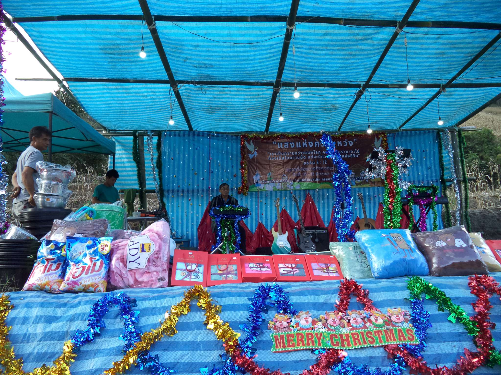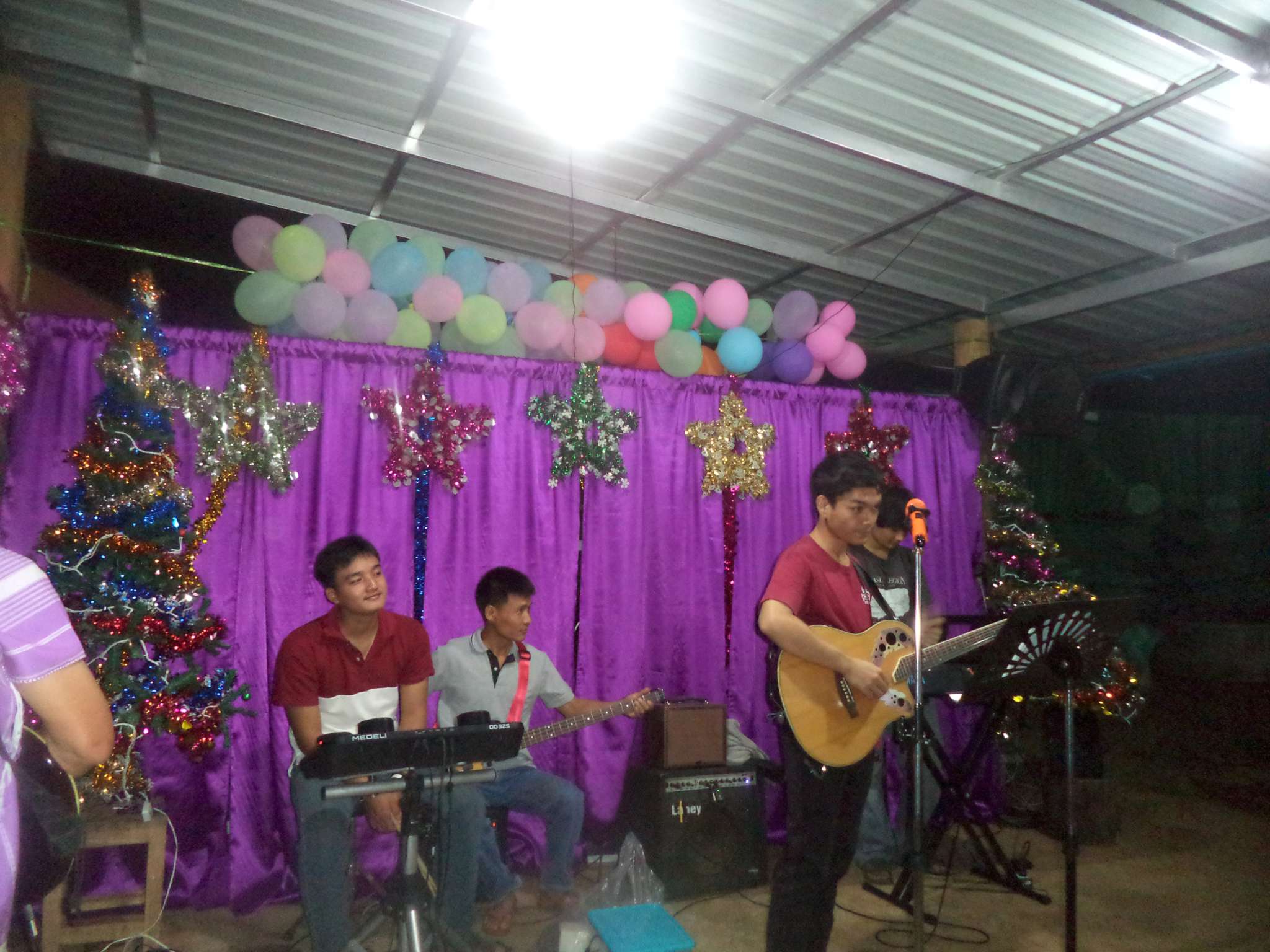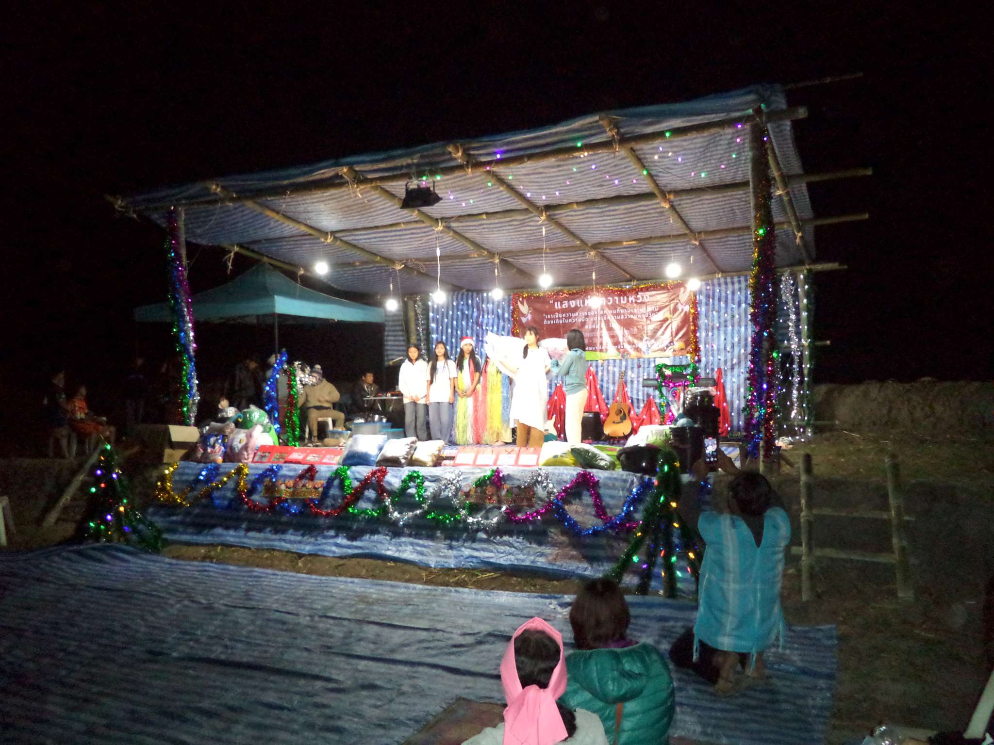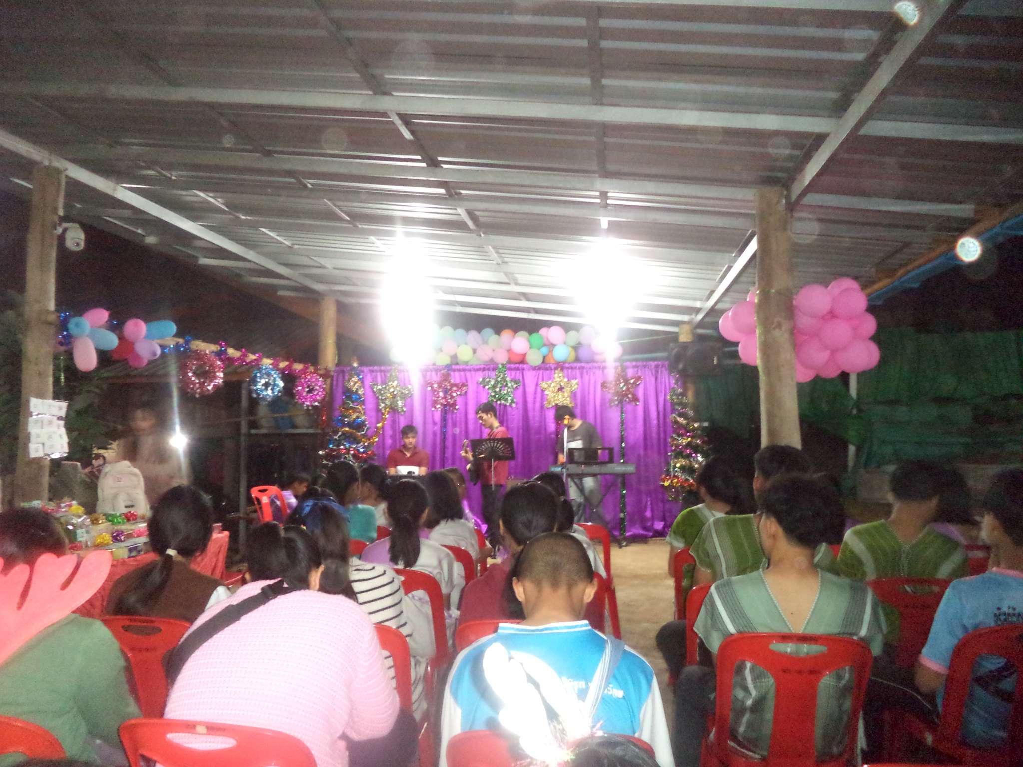Am 25.12. kamen neben den Gästen auch viele Helfer, vor allem aus der lokalen Kirchengemeinde, die Prapan, Mietda und die Kinder jeden Sonntag besuchen. Von dort konnte auch einiges an Equipment (Tontechnik, Stühle etc.) und Dekoration (z.B. Vorhänge der Bühnendeko) geliehen werden.