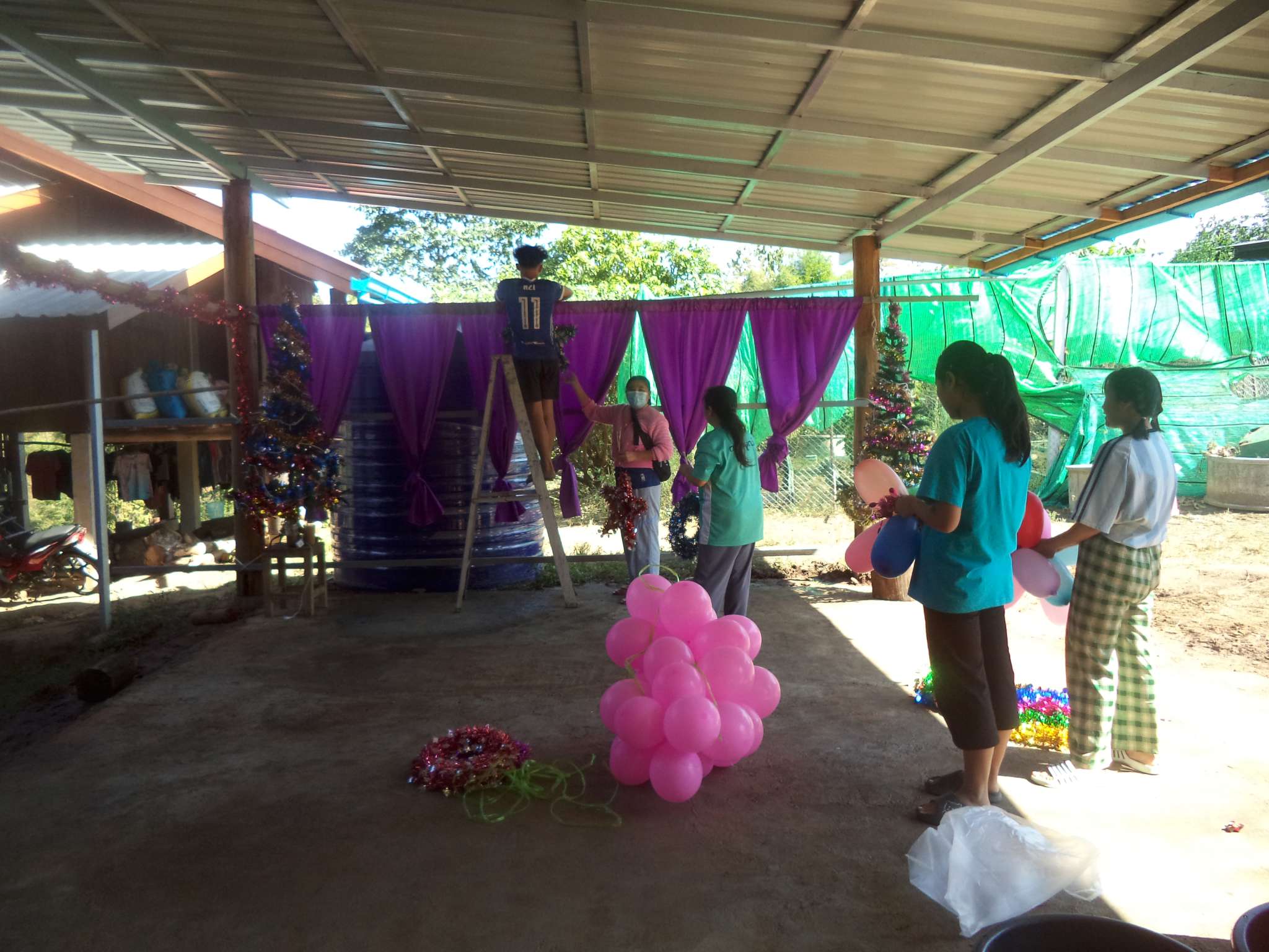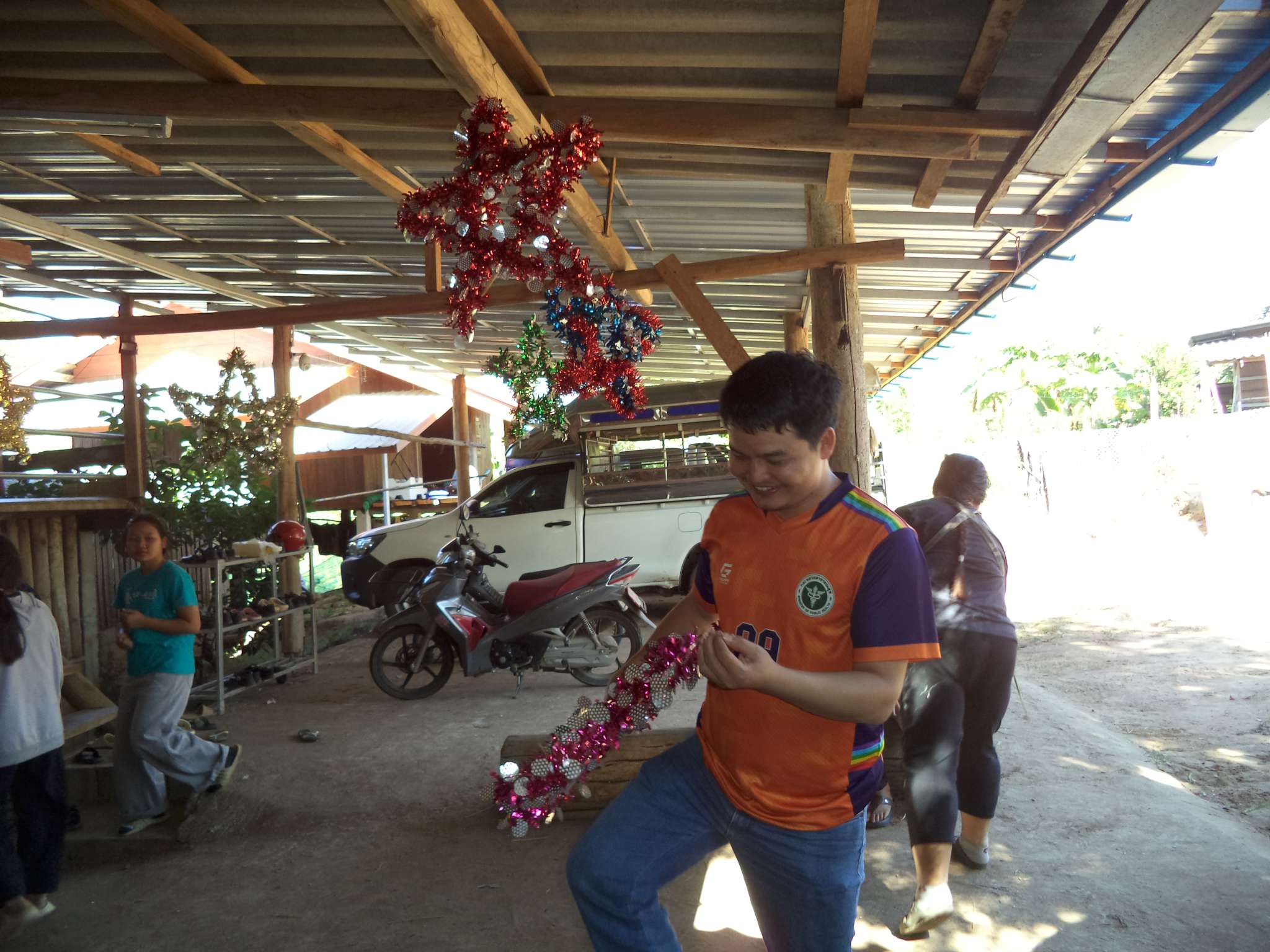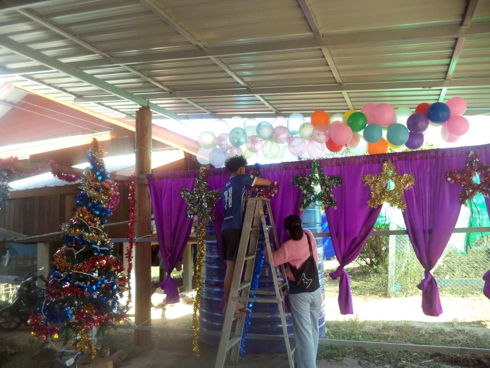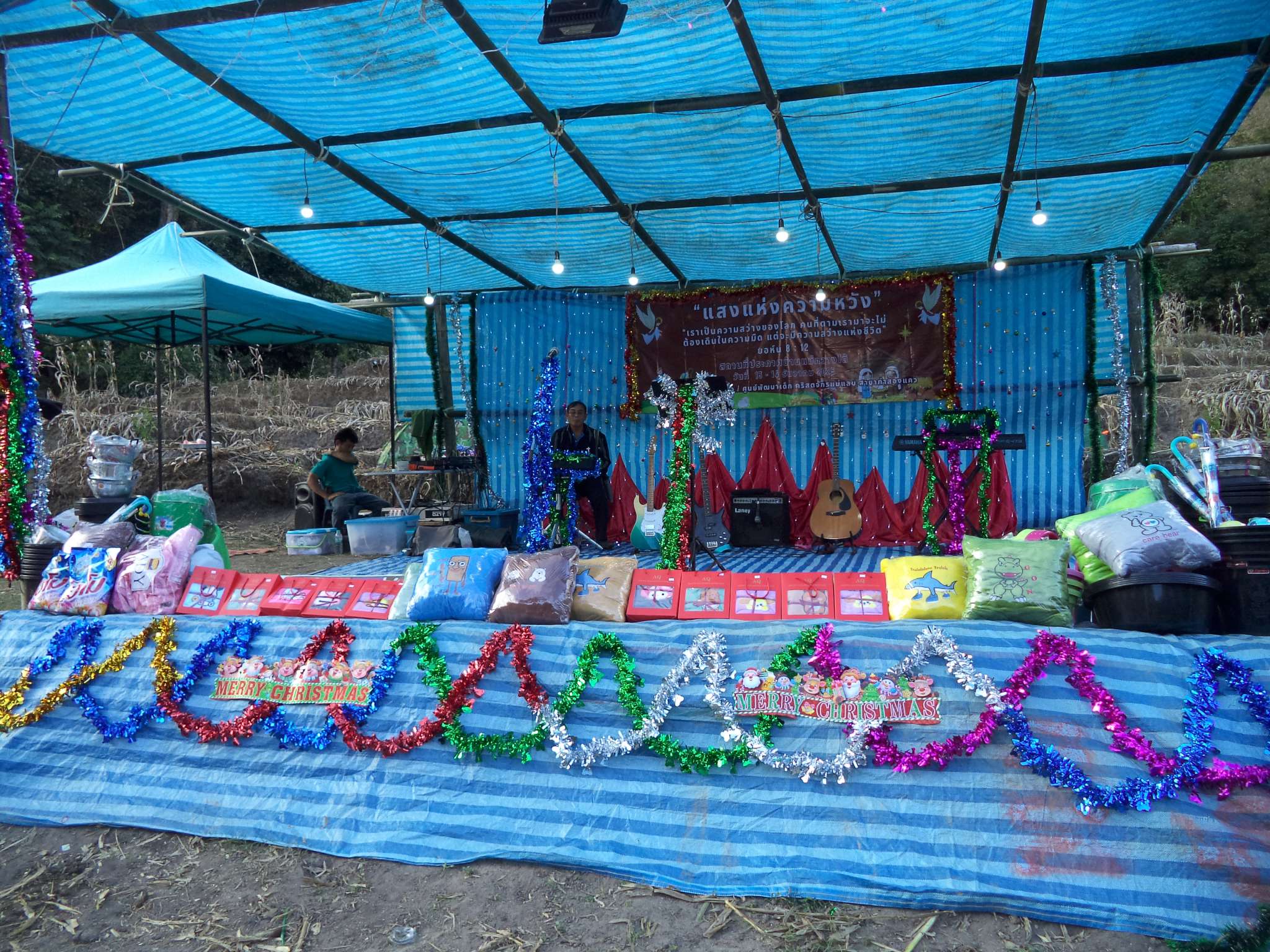 Am 25.12. kamen neben den Gästen auch viele Helfer, vor allem aus der lokalen Kirchengemeinde, die Prapan, Mietda und die Kinder jeden Sonntag besuchen. Von dort konnte auch einiges an Equipment (Tontechnik, Stühle etc.) und Dekoration (z.B. Vorhänge der Bühnendeko) geliehen werden.