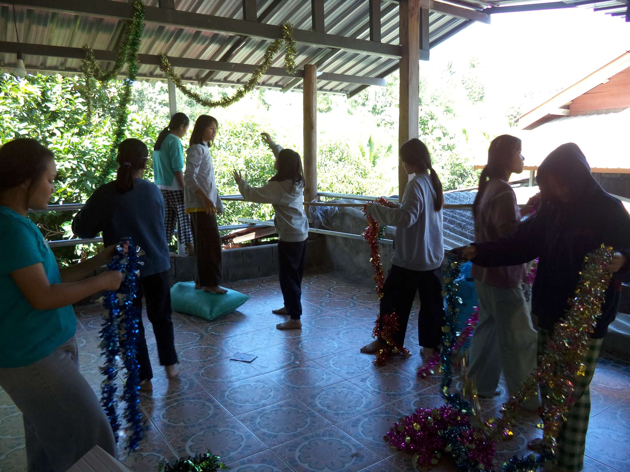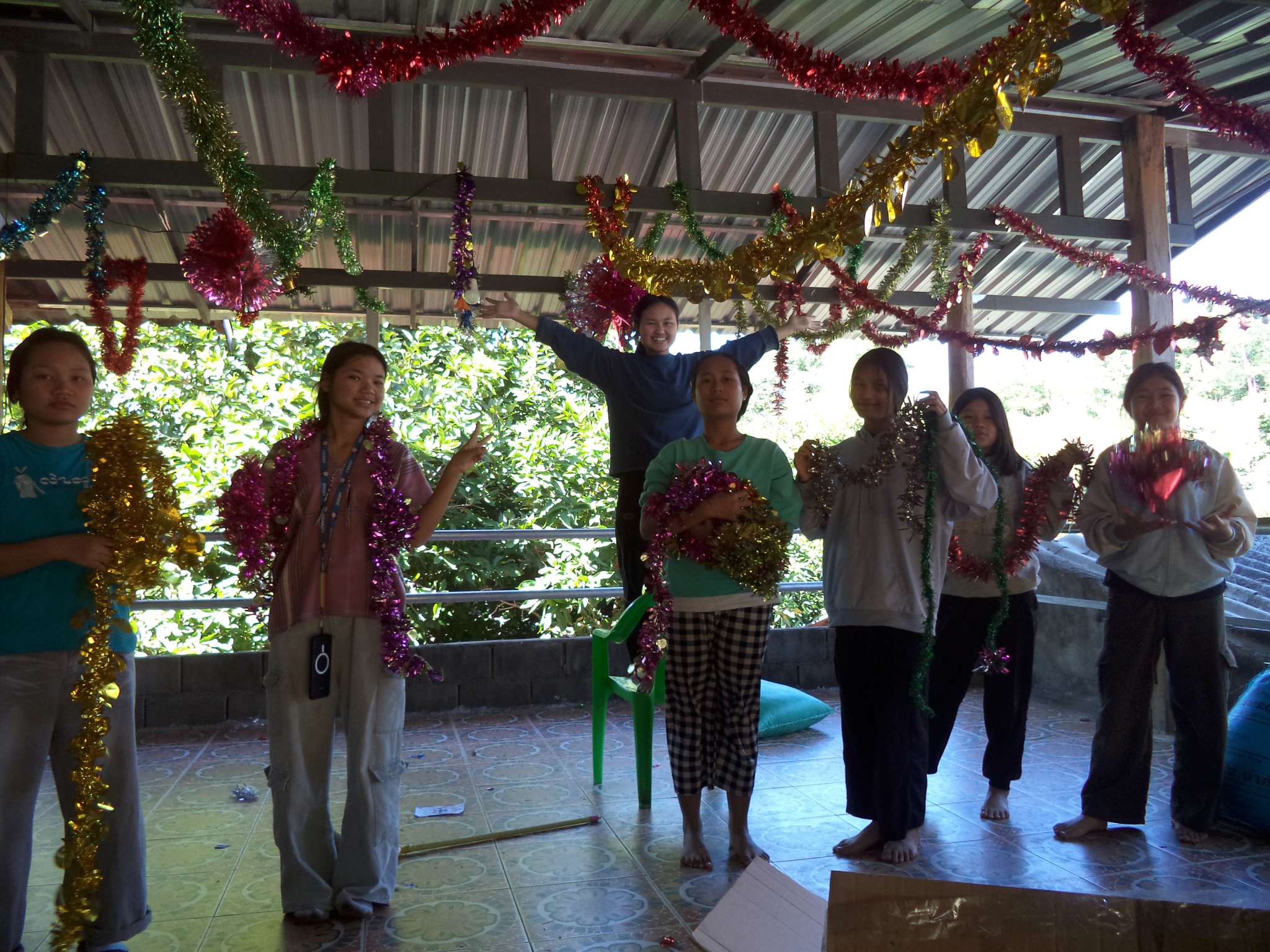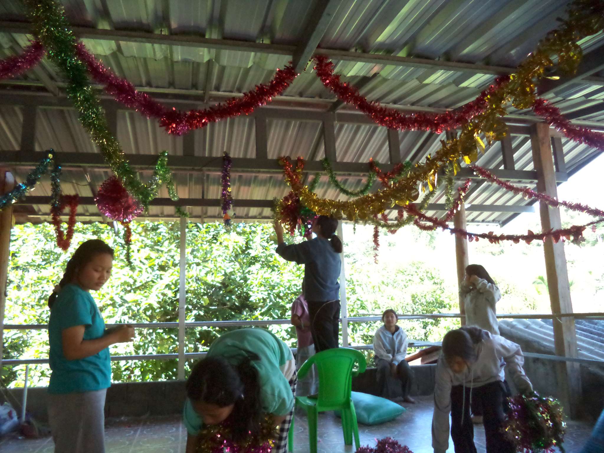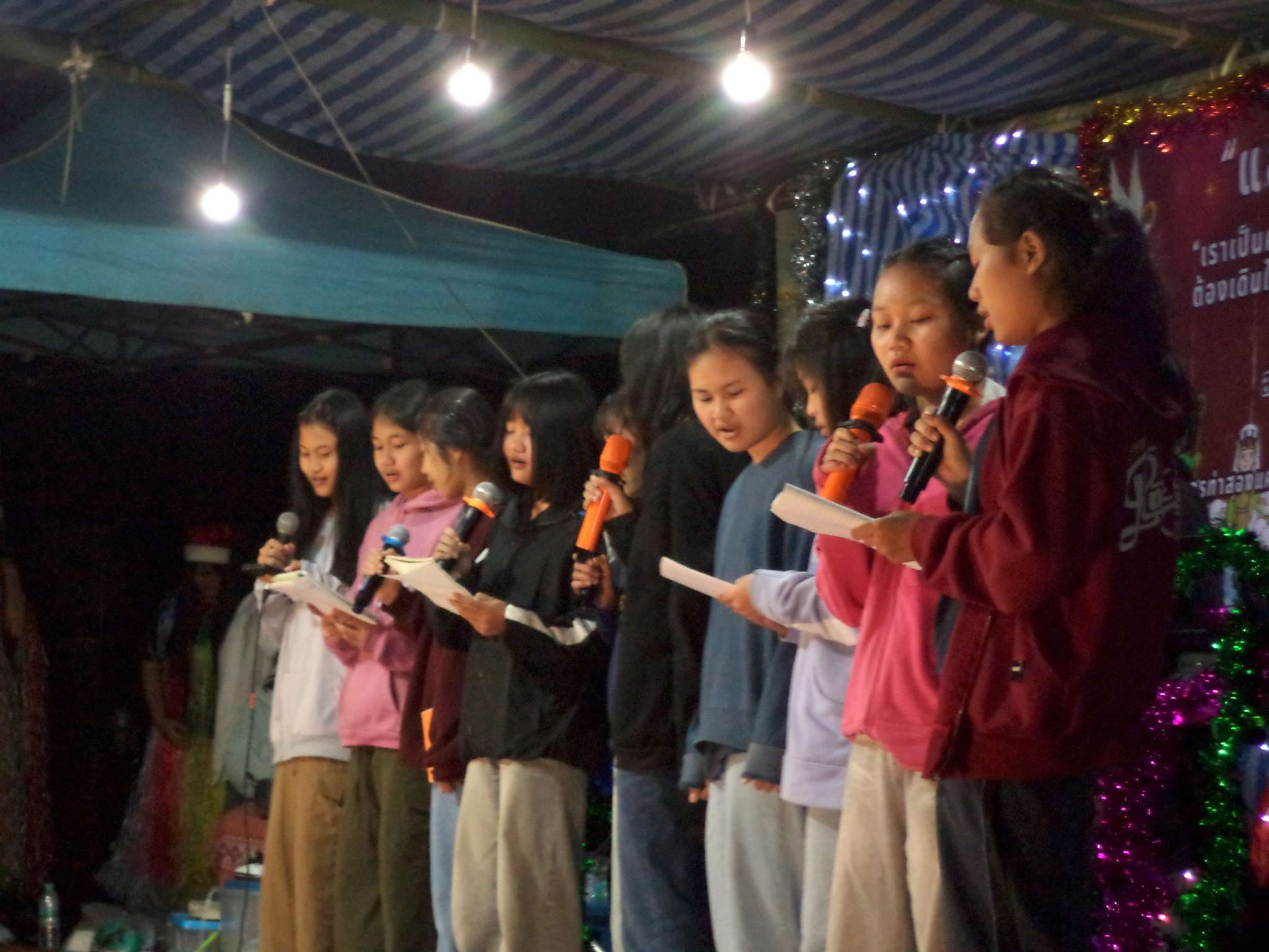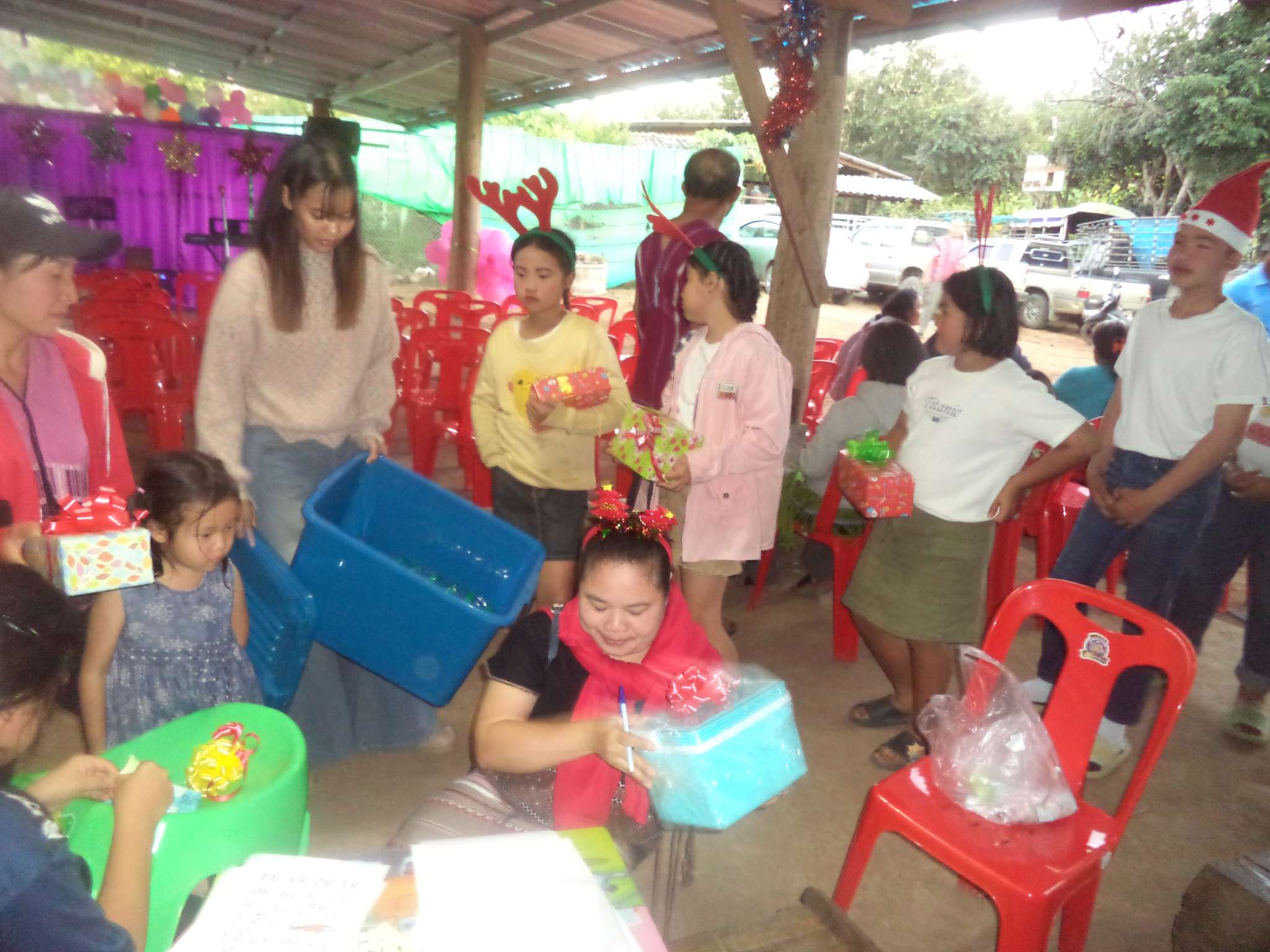 Am 25.12. kamen neben den Gästen auch viele Helfer, vor allem aus der lokalen Kirchengemeinde, die Prapan, Mietda und die Kinder jeden Sonntag besuchen. Von dort konnte auch einiges an Equipment (Tontechnik, Stühle etc.) und Dekoration (z.B. Vorhänge der Bühnendeko) geliehen werden.