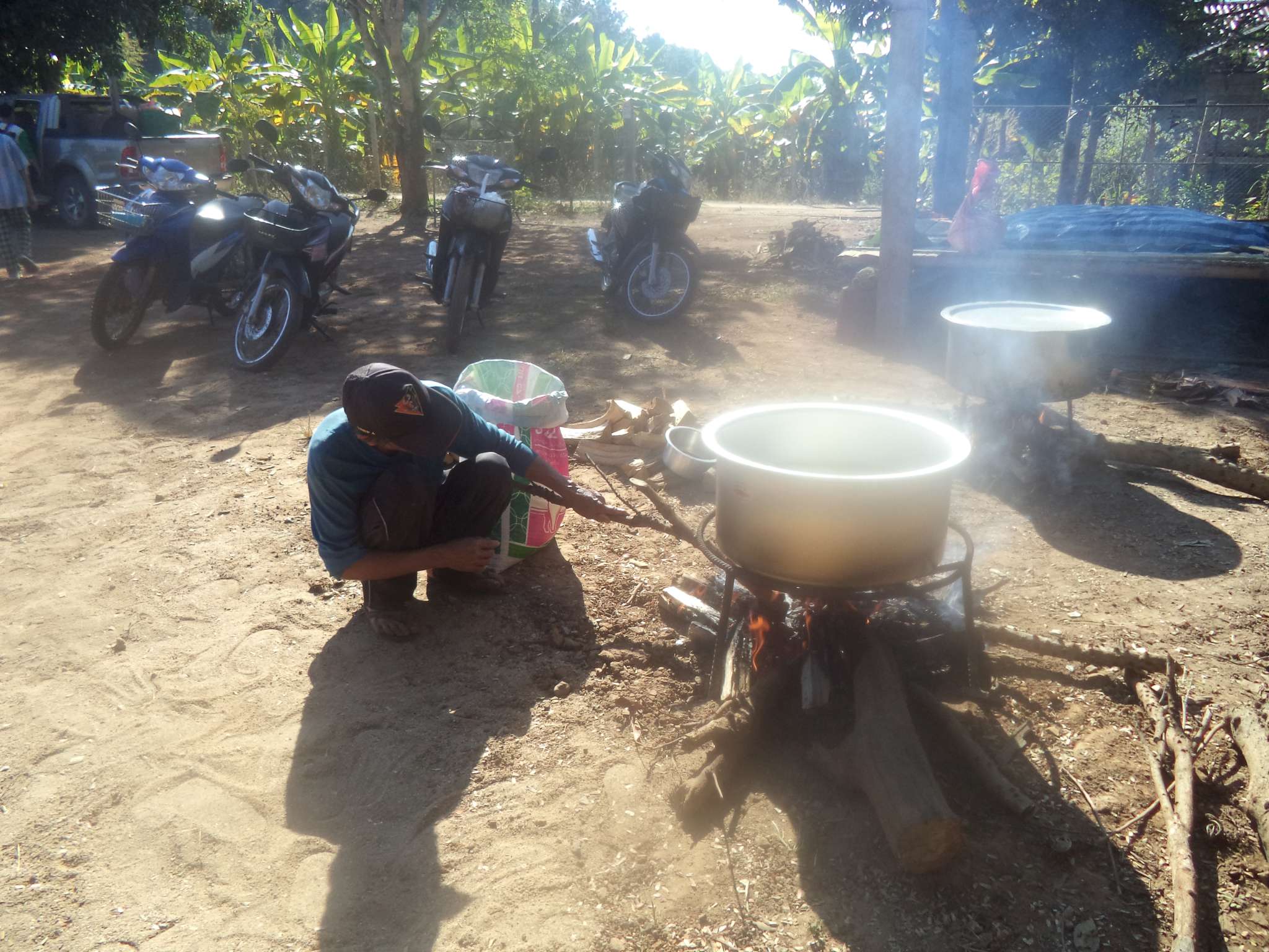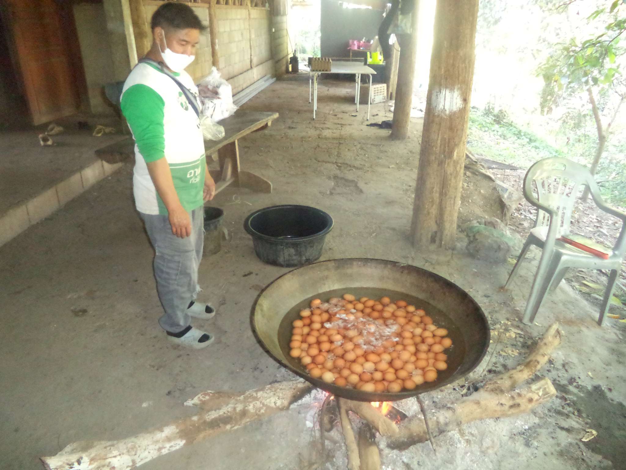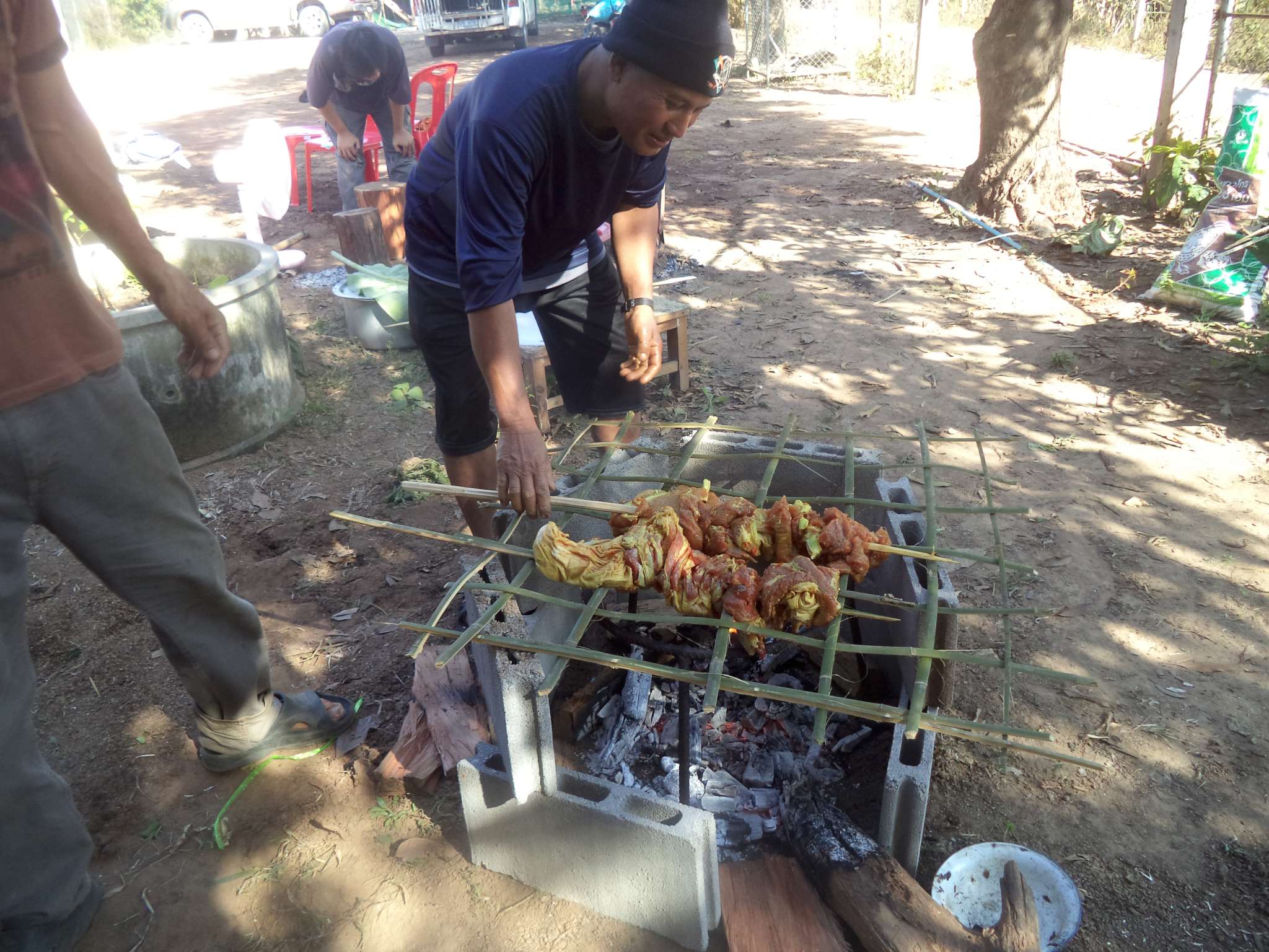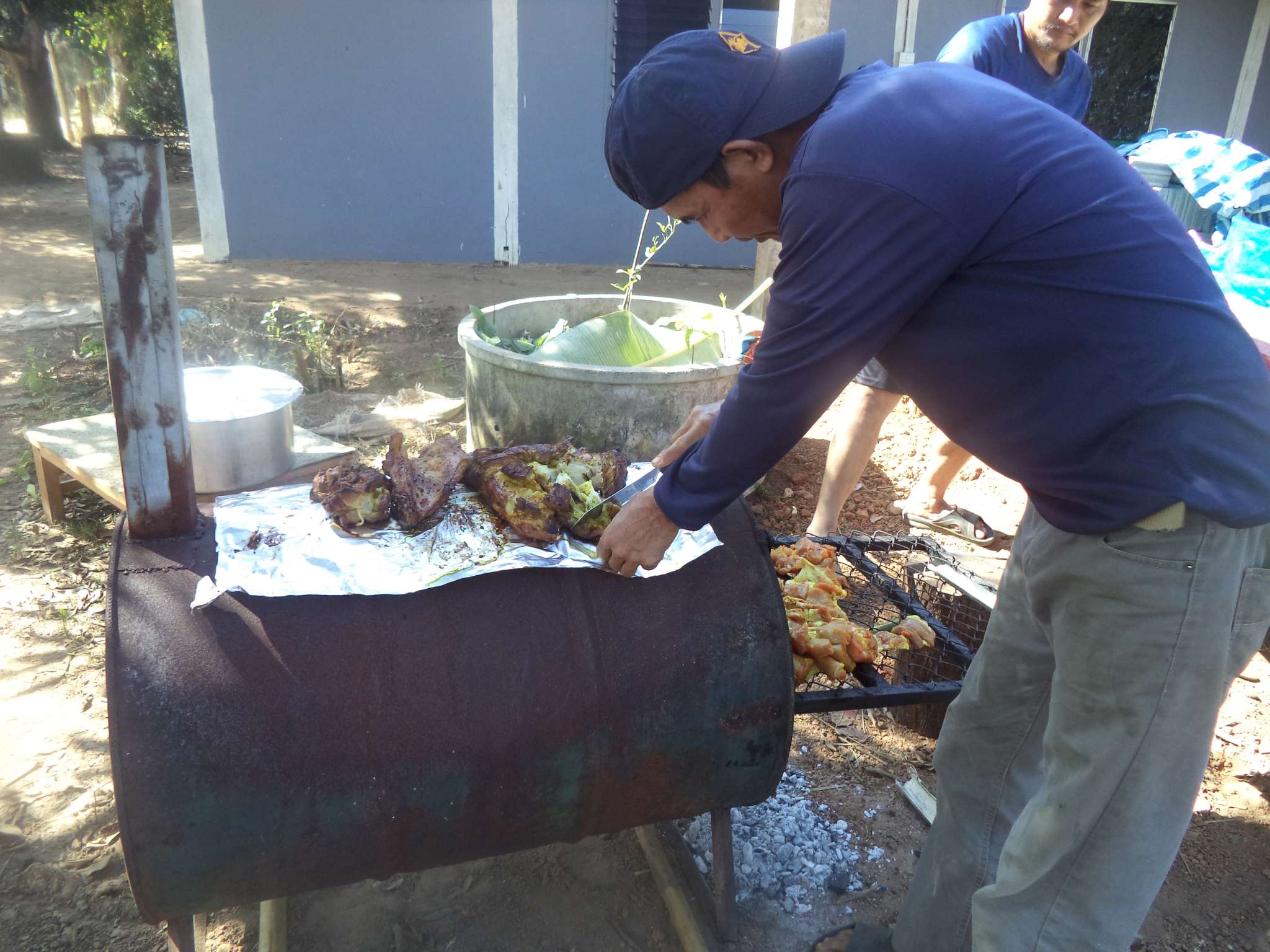 Anschließend wurde der Reis vorportioniert, die Eier geschält und die ersten Hühnerflügel gebraten. Im nächsten Schritt wurden die provisorisch errichteten Grills (mit Grillrost aus frischem Bambus 😉 ) sowie der Fassofen angefeuert, um das Fleisch des zuvor geschlachteten Schweins zu grillen. Würstchen wurden frittiert, Teller und Schüsseln vorbereitet und die Stühle im Carport gestellt.