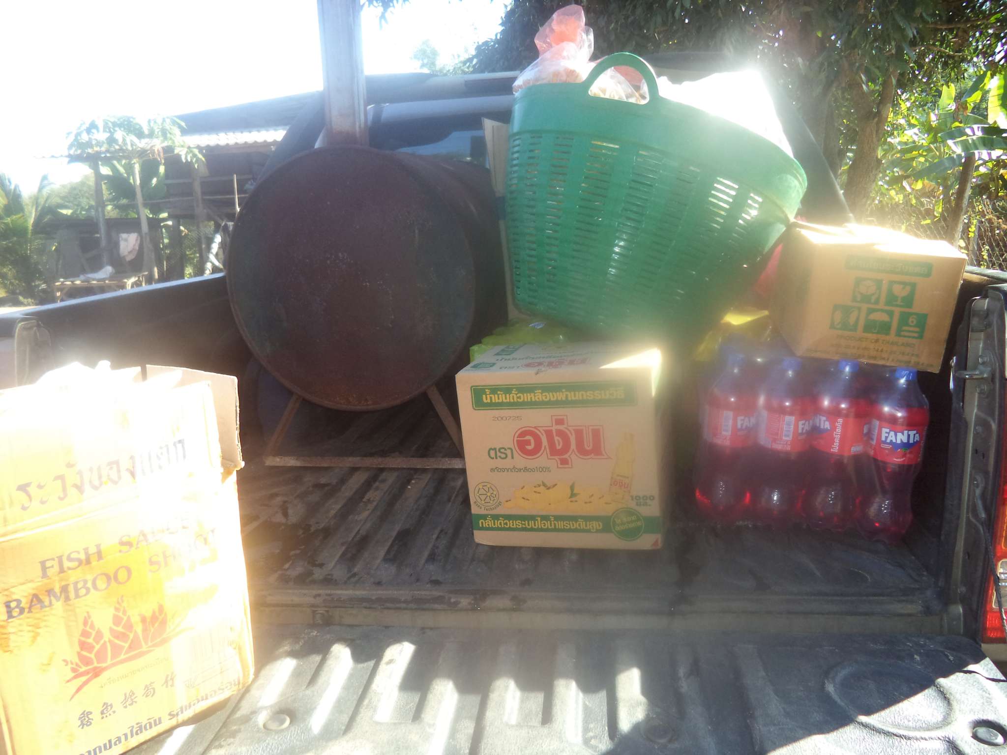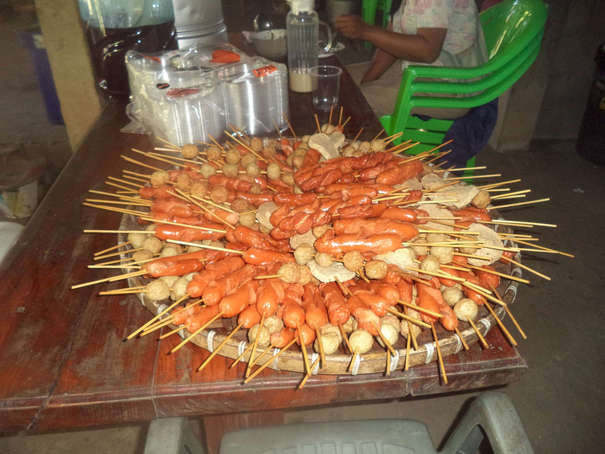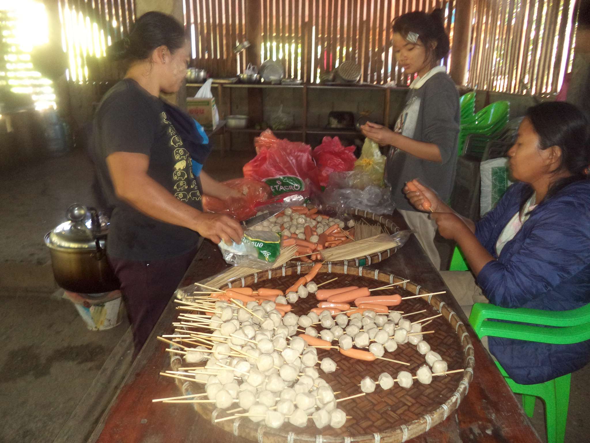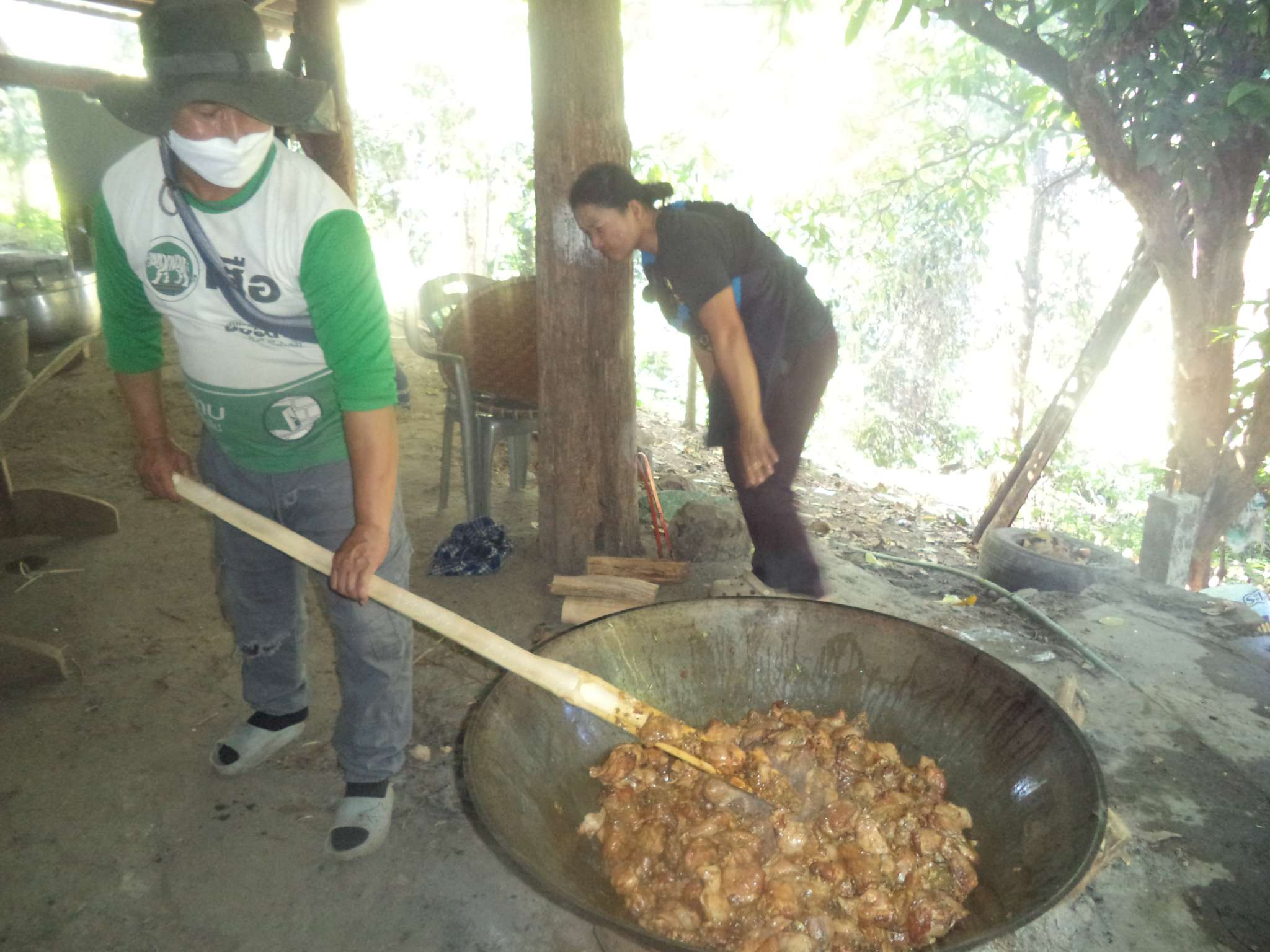 Anschließend wurde der Reis vorportioniert, die Eier geschält und die ersten Hühnerflügel gebraten. Im nächsten Schritt wurden die provisorisch errichteten Grills (mit Grillrost aus frischem Bambus 😉 ) sowie der Fassofen angefeuert, um das Fleisch des zuvor geschlachteten Schweins zu grillen. Würstchen wurden frittiert, Teller und Schüsseln vorbereitet und die Stühle im Carport gestellt.