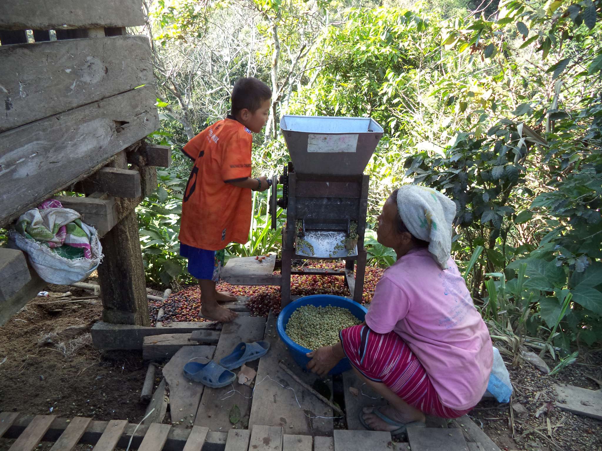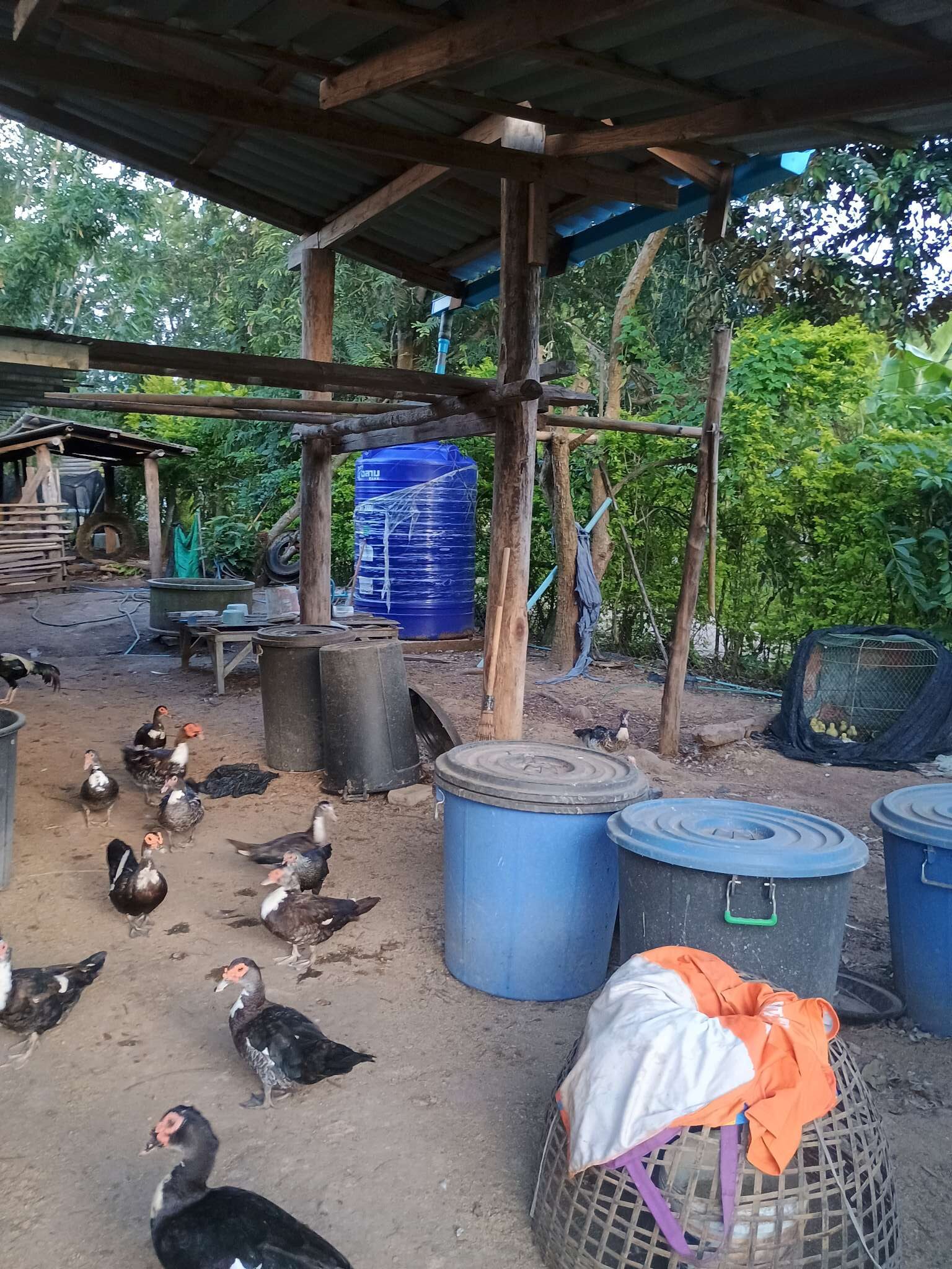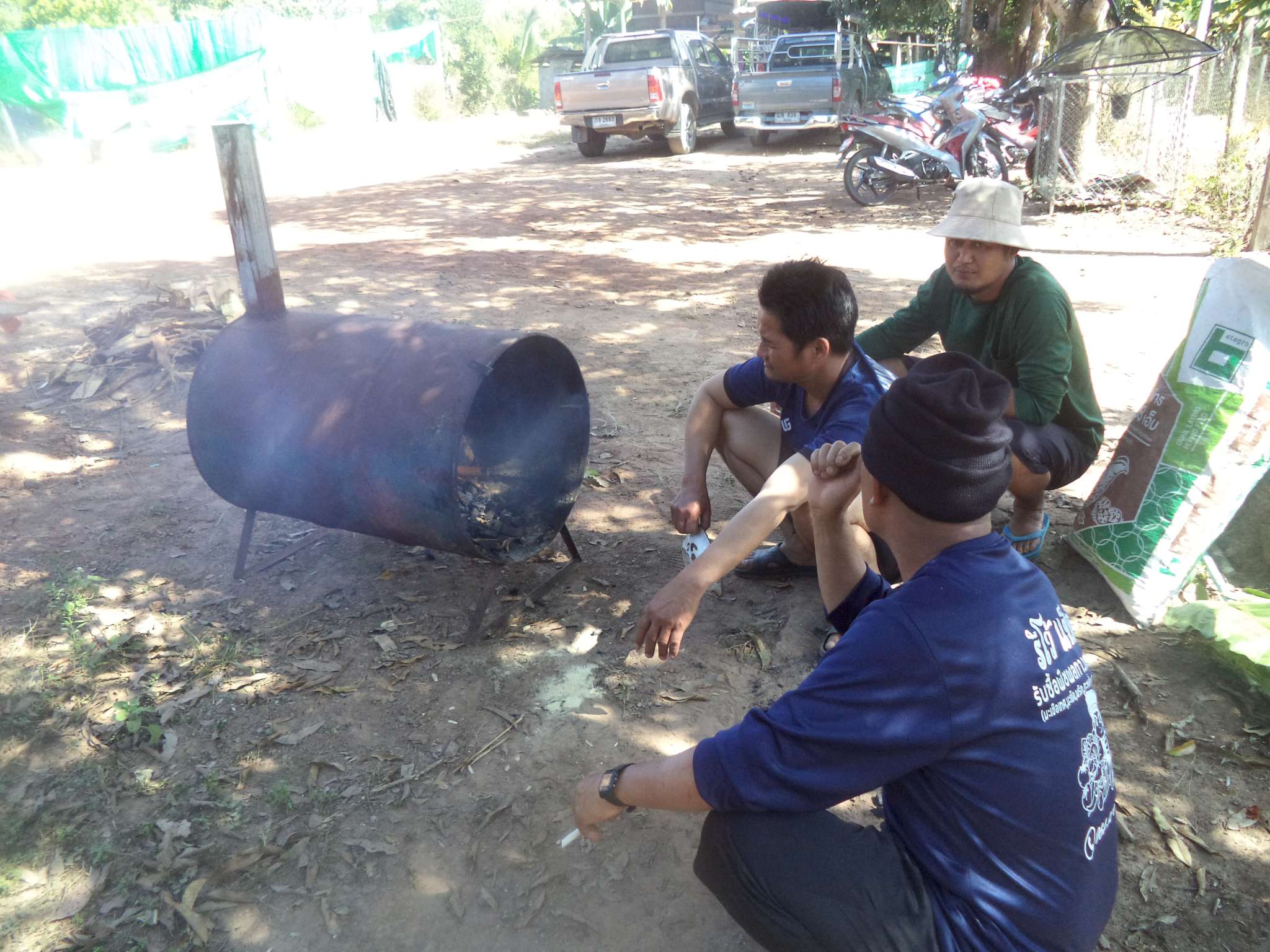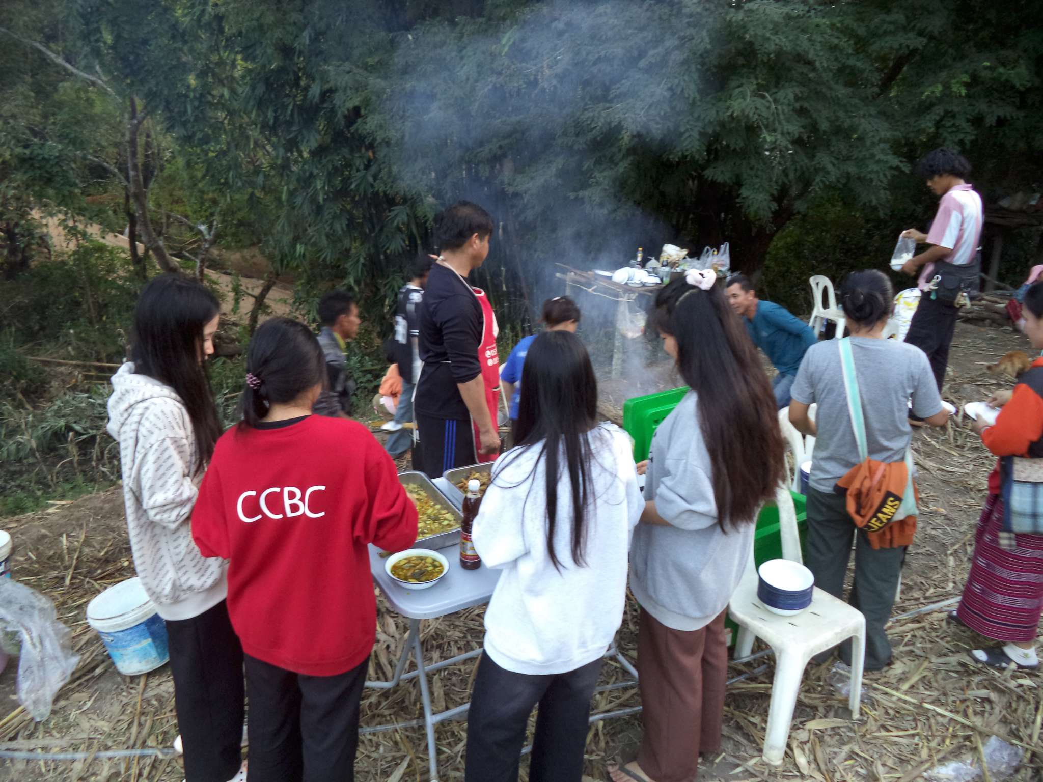 Anschließend wurde der Reis vorportioniert, die Eier geschält und die ersten Hühnerflügel gebraten. Im nächsten Schritt wurden die provisorisch errichteten Grills (mit Grillrost aus frischem Bambus 😉 ) sowie der Fassofen angefeuert, um das Fleisch des zuvor geschlachteten Schweins zu grillen. Würstchen wurden frittiert, Teller und Schüsseln vorbereitet und die Stühle im Carport gestellt.